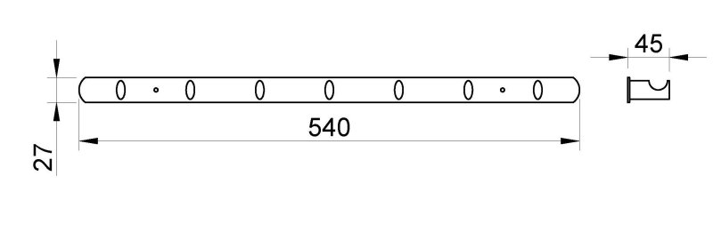 Вешалка с семью крючками. Надежная конструкция, устойчивость к коррозии. Подходит для общественных мест. Изготовлена из Zamac (сплав цинка, алюминия, магния и меди). Размеры: 27 мм в высоту x 540 мм в ширину x 45 мм в глубину.