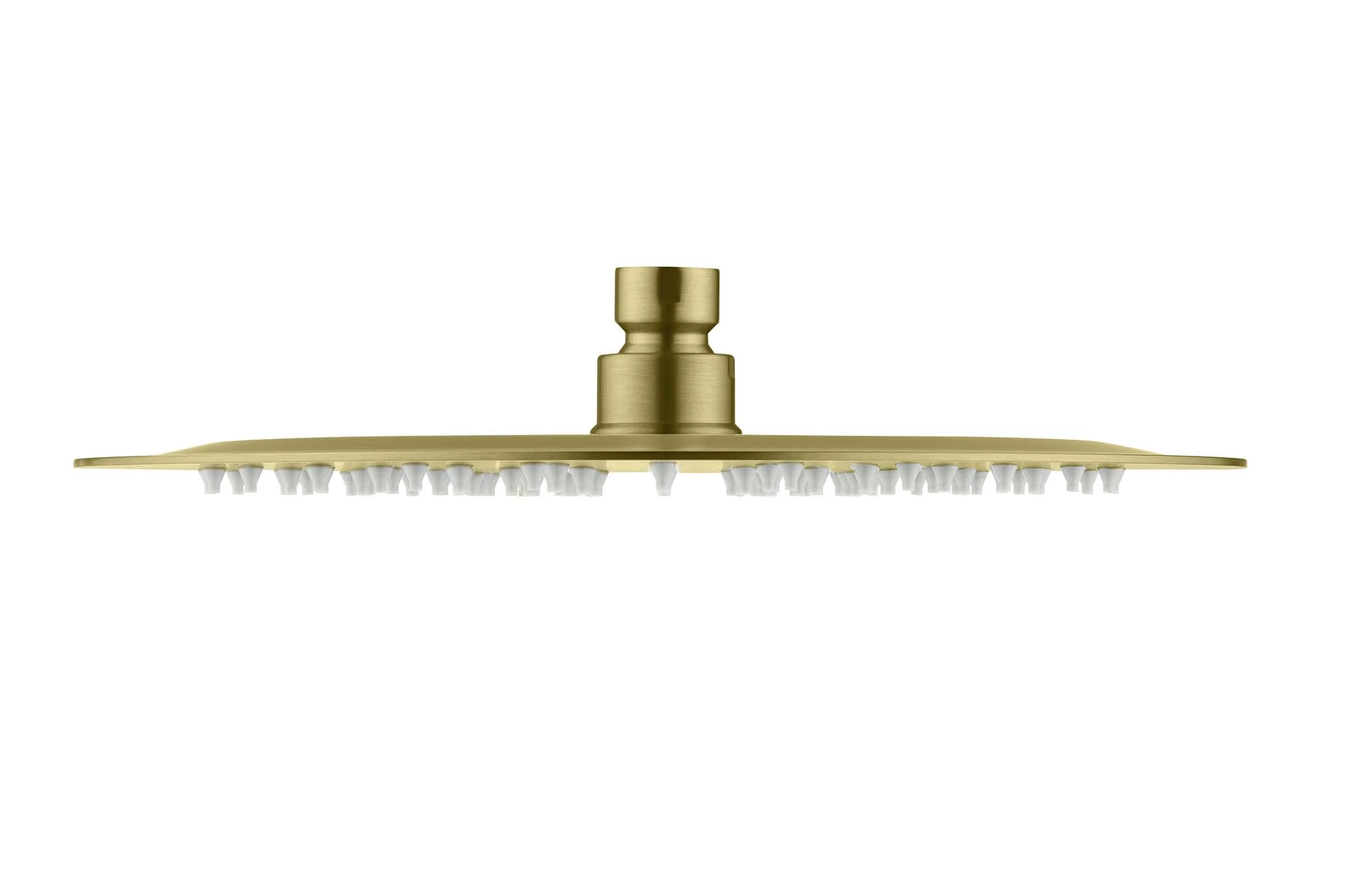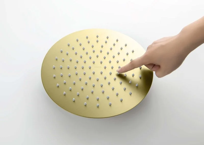 AQ2073BG круглый верхний душ 250×2 мм, шлифованное золото Технические характеристики ⦁ Материал: нержавеющая сталь — высокая коррозионная стойкость, долговечность. ⦁ Покрытие: шлифованное золото — премиальный внешний вид, устойчивость к царапинам и загрязнениям. ⦁ Диаметр: 250 мм, толщина: 2 мм — сверхтонкая конструкция для современного интерьера. ⦁ Форма: круглая, равномерное распределение воды по всей поверхности. ⦁ Присоединительная резьба: 1/2" — стандартное подключение, совместим с большинством душевых систем. ⦁ Монтаж: настенный или потолочный, универсальная установка. ⦁ Функция легкой очистки: система rub clean для быстрого удаления известкового налёта. ⦁ Гарантия: 24 месяца. Преимущества и отличия ⦁ Сверхтонкий корпус (2 мм) минимизирует вес и создаёт эффект парящей лейки. ⦁ Латунное шарнирное соединение обеспечивает гибкую регулировку угла наклона. ⦁ Стильное шлифованное покрытие подчёркивает статус и современность проекта. ⦁ Простая очистка и минимальное обслуживание — идеален для коммерческих и жилых объектов. Область применения ⦁ Рекомендуется для ванных комнат премиум-класса, гостиниц, SPA-зон, дизайнерских санузлов, где важны надежность, эстетика и простота ухода.