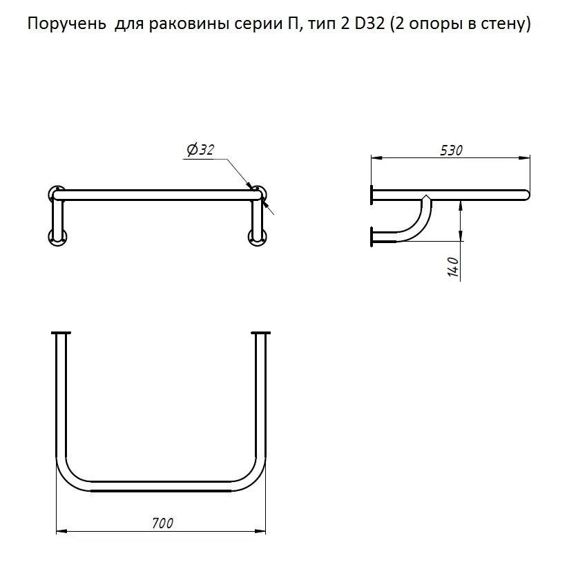 Комплект: поручень с 2 опорами для крепления в стену, монтажными элементами и уплотнителями (без дополнительных аксессуаров); подходит для раковин серии П (стандартные умывальники в ванных), монтируется в 2 точки на стену. Интегрируется в стандартные санузлы без пайки; нержавейка обеспечивает антикоррозийную стойкость. Отличается от типа 1 (П1D32) удлинённой дугой для большего охвата, превосходя алюминиевые аналоги по прочности и долговечности.