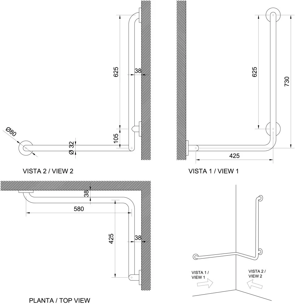 Поручень для установки в угол с тремя точками опоры матовый правый.