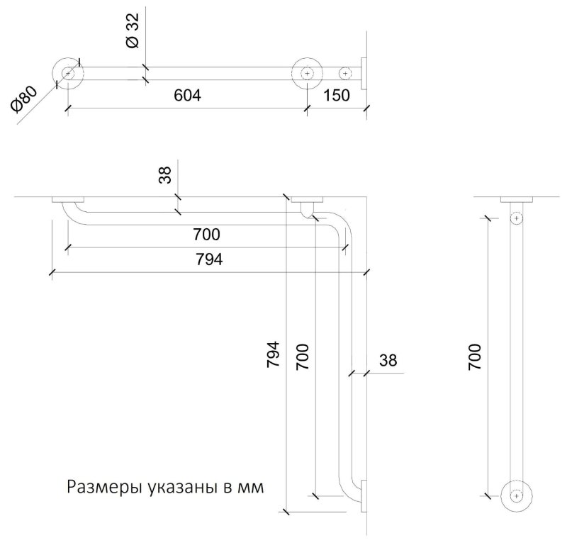 Поручень горизонтальный для установки в угол с 3 точками опоры для людей с ограниченными возможностями, матовый. Диаметр Ø 32 мм, толщина 1,5 мм. 38 мм от стены.