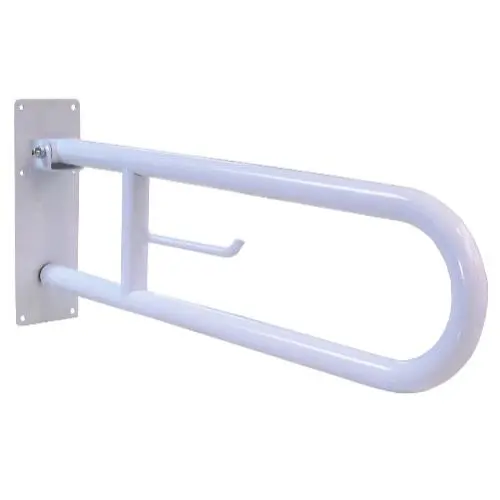Поручень полукруглый для людей с ограниченными возможностями 600 мм из нержавеющей стали AISI304. С держателем для бумаги. Полукруглый откидной поручень идеально подойдет для комплектации практически любого санузла для людей с ограниченными возможностями. Максимальная нагрузка на эту модель составляет 120 кг, поэтому производитель настоятельно рекомендует использовать в санузле также и другие пристенные поручни