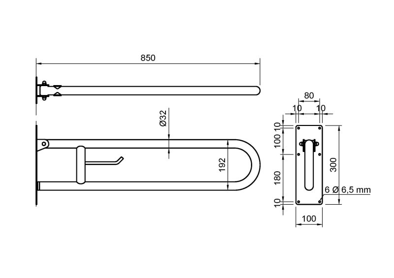 Поручень полукруглый для людей с ограниченными возможностями из нержавеющей стали AISI304. С держателем для бумаги. Поручень откидной устанавливается на стену с помощью 6 винтов крепления, которые поставляются в комплекте с устройством. Максимальная нагрузка на поручень не должна превышать 120 кг, матовый, длина 850мм, диаметр Ø 32 мм.