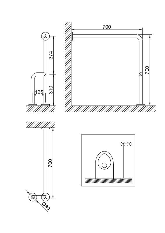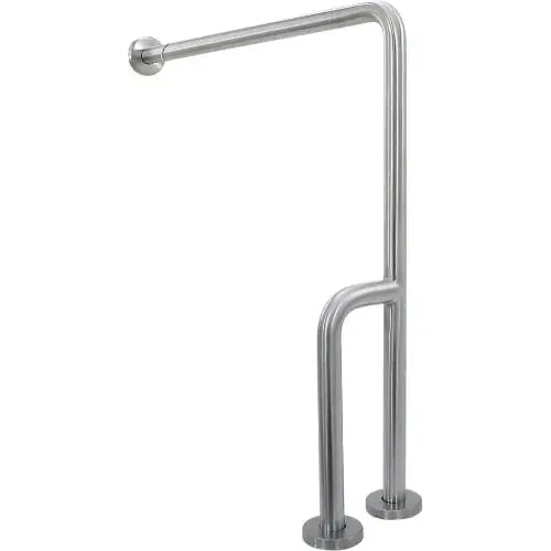 Поручень правый под углом 90 ⁰ для людей с ограниченными возможностями из нержавеющей стали AISI 304 с одним настенным и двумя напольными опорами, матовый. Диаметр Ø 32 мм, толщина 1,5 мм.