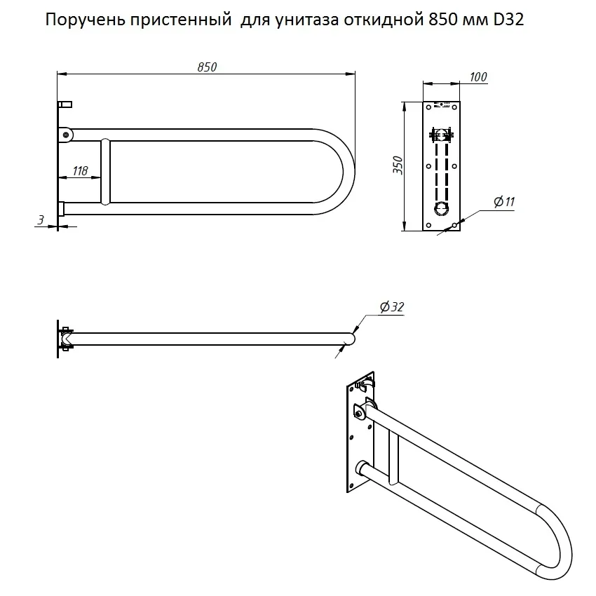 Комплект поставки: откидной пристенный поручень, анкерные болты, шурупы, уплотнители и фиксатор механизма (без бумагодержателей или дополнительных опор); совместим с напольными и подвесными унитазами серий Cersanit, Roca или отечественных моделей в санузлах от 1,2 м², монтируется на бетон, кирпич или усиленный гипсокартон без сварки. Отличается от фиксированной модели ППУ/850D32 откидным механизмом для компактного хранения, превосходя алюминиевые импортные аналоги (типа Geberit) по толщине стенки и устойчивости к частым складываниям в зонах интенсивного использования.