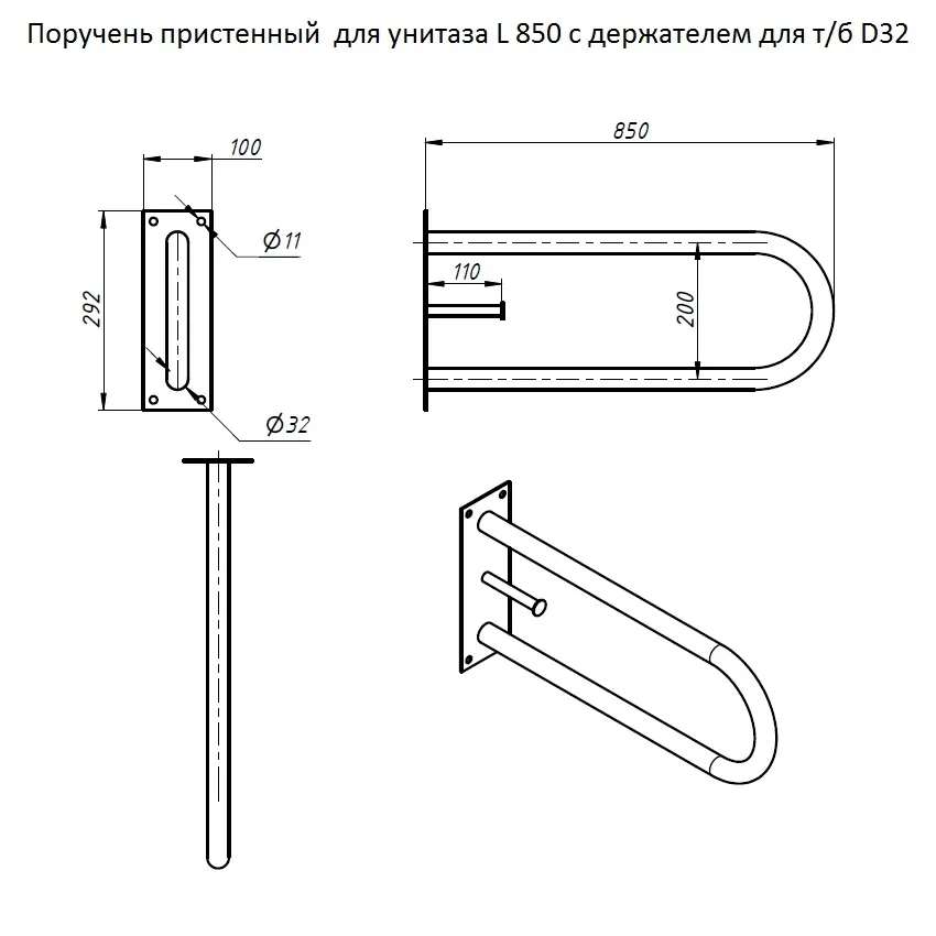 Комплект поставки: пристенный поручень с держателем для рулонов туалетной бумаги, анкерные болты, шурупы и уплотнители (без откидных механизмов или дополнительных аксессуаров); совместим с напольными и подвесными унитазами серий Cersanit, Roca или отечественных моделей в санузлах от 1,2 м², монтируется на бетон, кирпич или усиленный гипсокартон без специальных инструментов. Отличается от базовой модели ППУ/850D32 встроенным держателем для оптимизации пространства, превосходя алюминиевые импортные варианты (типа Geberit) по толщине стенки и стойкости к механическим нагрузкам в зонах с высокой влажностью.