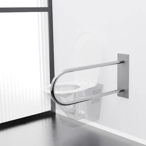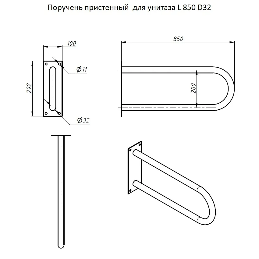 Комплект поставки: пристенный поручень, анкерные болты, шурупы и уплотнители (без откидных механизмов или дополнительных опор); совместим с напольными и подвесными унитазами серий Cersanit, Roca или отечественных моделей в санузлах от 1,2 м², монтируется на бетон, кирпич или гипсокартон с усилением без сварки. Отличается от напольных аналогов (типа ПУОнаСт/850D32) компактным настенным креплением для ограниченного пространства, превосходя алюминиевые импортные варианты (типа Moen) по толщине стенки и устойчивости к вибрациям в общественных зонах.
