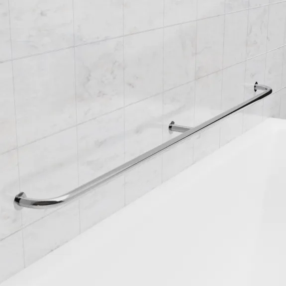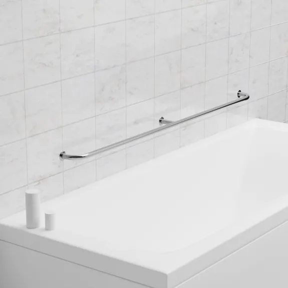 Монтаж занимает 12-18 мин: разметить точки с шагом 1100 мм, просверлить отверстия 8-10 мм и зафиксировать анкерами (под плитку или панели), с регулировкой высоты 700-900 мм для подгонки. Уход упрощен еженедельной протиркой микрофиброй с нейтральным средством, устойчивость к дезинфицирующим реагентам и УФ без потери блеска в первые 7 лет. Оптимален для больших санузлов в реконструкциях под нормы инклюзии, повышая безопасность без ущерба для пространства.
