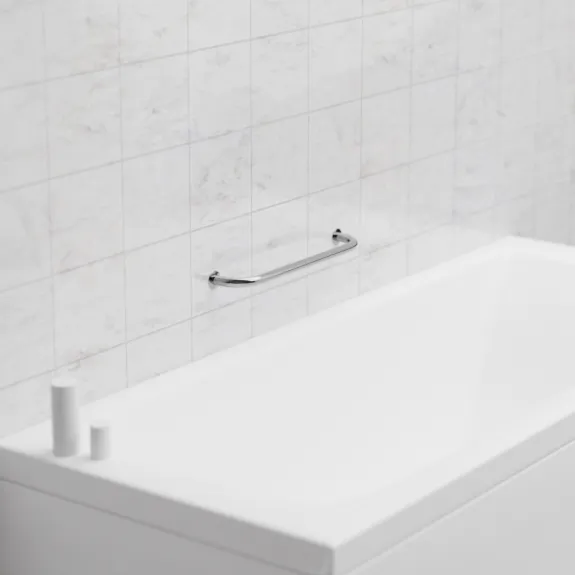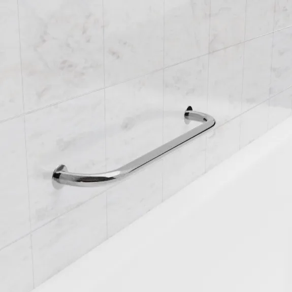 Монтаж занимает 8-12 мин: разметить точки с шагом 350 мм, просверлить отверстия 8-10 мм и зафиксировать анкерами (под плитку или панели), с регулировкой высоты 700-900 мм для подгонки. Уход упрощен еженедельной протиркой микрофиброй с нейтральным средством, устойчивость к дезинфицирующим реагентам и УФ без потери блеска в первые 7 лет. Оптимален для средних санузлов в реконструкциях под нормы инклюзии, повышая безопасность без ущерба для пространства.