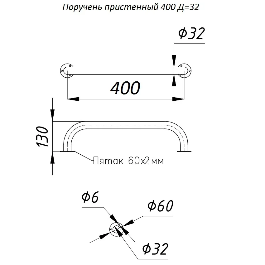 Настенный пристенный поручень из нержавеющей стали AISI 304 (диаметр трубы 32 мм, толщина стенки 2 мм), прямой конфигурации для опоры; габариты: длина 400 мм, высота 130 мм, глубина 100 мм, вес 2-3 кг. Поверхность полированная глянцевая с хромированием для антикоррозийной защиты и гигиеничности, выдерживает статическую нагрузку до 100 кг, монтаж в 2 точки на стену анкерными болтами M6-M8. Соответствует нормам ГОСТ Р 51251-2007 и EN 12021 для инклюзивной сантехники; производство Тругор (Россия), артикул Пп 400 D=32 мм(304), гарантия 1 год, дизайн минималистичный с закругленными концами для комфортного хвата.