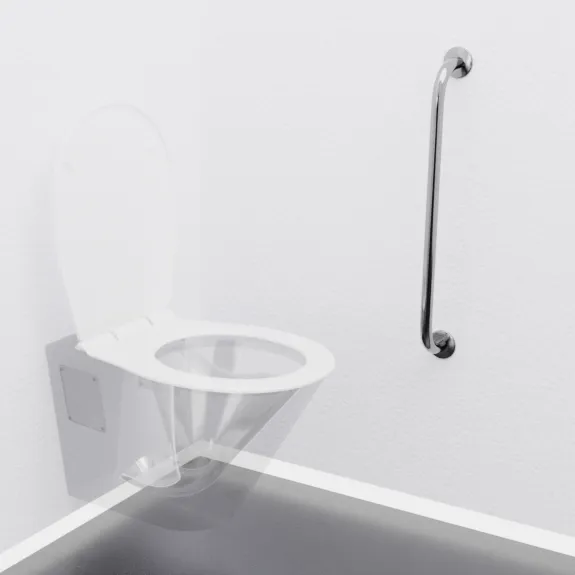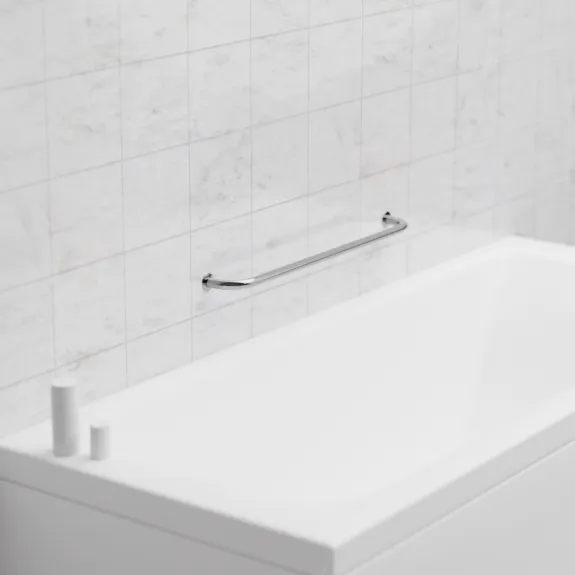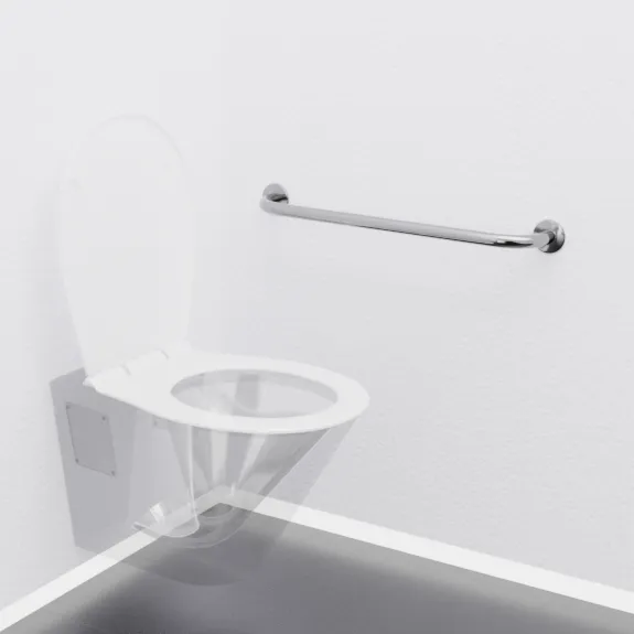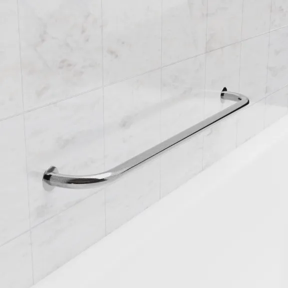 Монтаж занимает 10-15 мин: разметить точки с шагом 500 мм, просверлить отверстия 8-10 мм и зафиксировать анкерами (под плитку или панели), с регулировкой высоты 700-900 мм для подгонки. Уход упрощен еженедельной протиркой микрофиброй с нейтральным средством, устойчивость к дезинфицирующим реагентам и УФ без потери блеска в первые 7 лет. Оптимален для средних санузлов в реконструкциях под нормы инклюзии, повышая безопасность без ущерба для пространства.