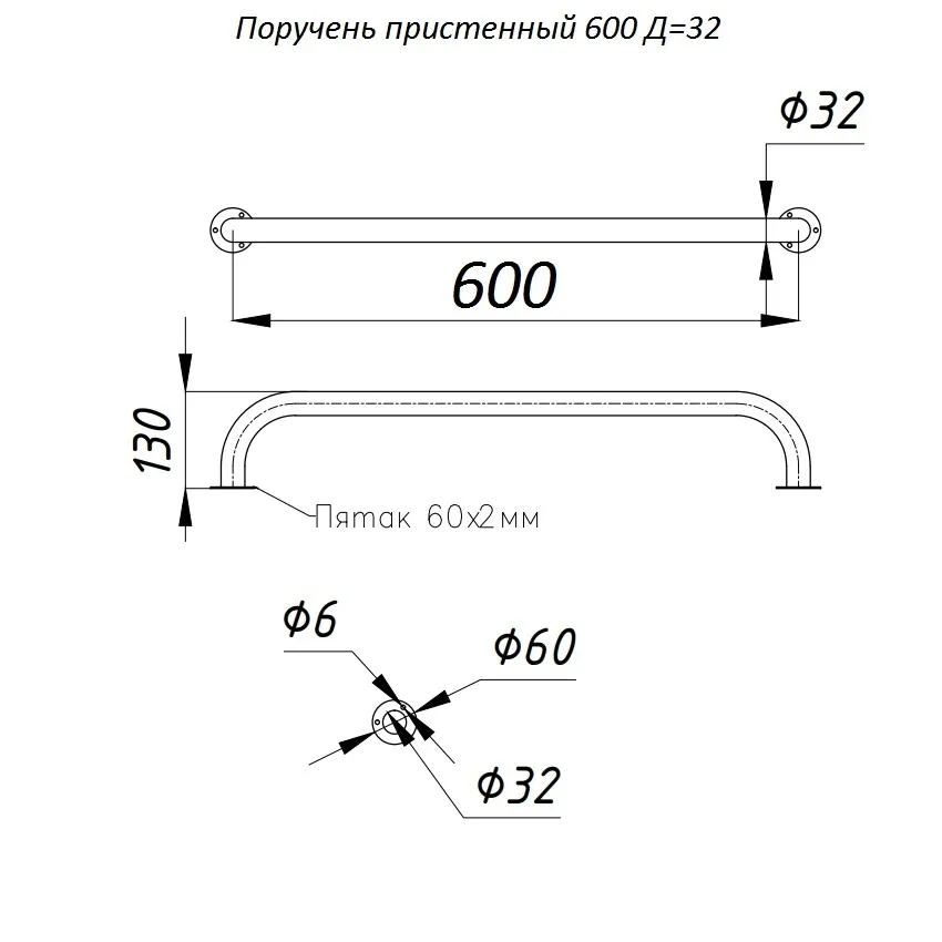Комплект поставки: пристенный поручень, анкерные болты, шурупы и уплотнители (без откидных механизмов или дополнительных опор); совместим с унитазами, раковинами и ваннами серий Cersanit, Roca или отечественных моделей в санузлах от 1,2 м², монтируется на бетон, кирпич или усиленный гипсокартон без сварки. Отличается от более короткого аналога (Пп 500 D=32 мм) увеличенной длиной для широкой зоны опоры, превосходя алюминиевые импортные варианты по толщине стенки и устойчивости к деформации в условиях высокой влажности.