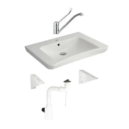 Эргономичный комплект для умывальника с двумя кронштейнами, сифоном и рычажным смесителем.