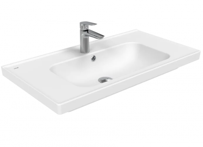 Размеры изделия составляют 91х25х50 см. Ширина раковины - 85 см, высота - 16,1 см, глубина - 46 см. Это мебельная раковина, выполненная из санфарфора. Смеситель расположен посередине. Цвет изделия - белый.