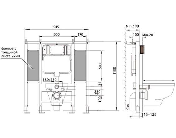 В комплекте | • Монтажная рама (металлический каркас, окрашенный антикоррозийной эмалью) • Панель для крепления поручней и опор • Уплотнительные кольца и манжеты, • Труба смыва, • Фановый отвод с удлинителем, • Защитный кожух ревизионного окна с крепежной рамкой и крышкой • Крепеж к стене, • Крепеж к полу, • Шпильки для унитаза, • Крепежная рамка, винты крепления, толкатели |