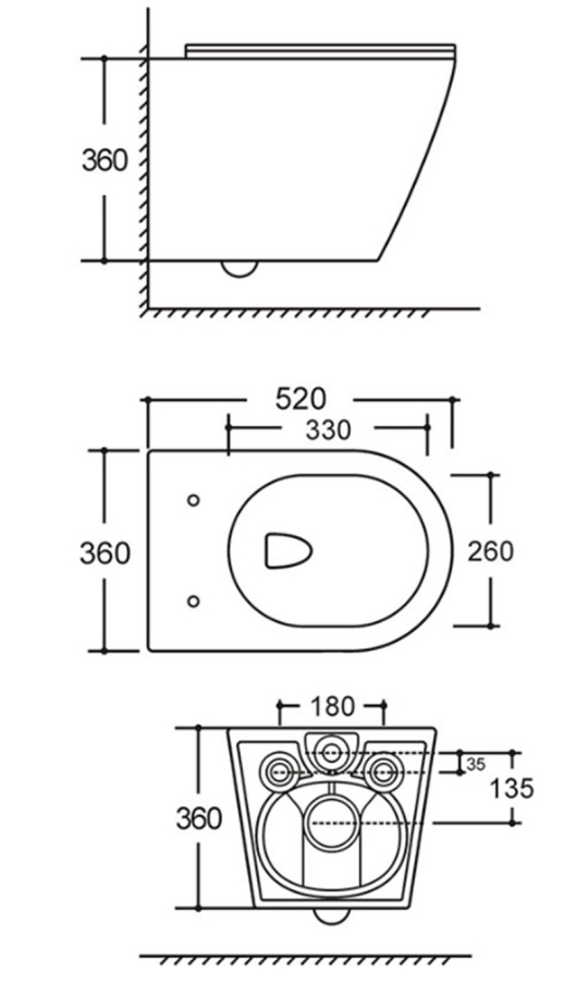 ⦁ Функции: Подвесной тип, безободковый (Rimless), система Tornado (3-кратное омывание чаши), горизонтальный выпуск (в стену), антивсплеск, каскадный слив, овальная форма, межосевое расстояние 180 мм.