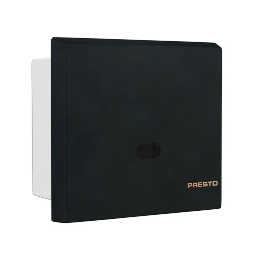 Встраиваемый электронный клапан смыва из латуни с антивандальной лицевой панелью из нержавеющей стали 304L (матовое чёрное покрытие), габаритами 135 × 153 × 44 мм и весом 0,5 кг; инфракрасный сенсор с дальностью обнаружения 80–120 см, длительностью слива 6 секунд (программируемая от 3 до 10 с), расход воды 8 л/мин при давлении 1–8 бар. Питание от сети 230 В (в комплекте трансформатор) или 4 батарейки AA (до 3 лет автономии), электромагнитный запорный клапан с автоматическим отключением при утечке; встроенная функция экономии (дути-флаш каждые 24 ч) и регулировка интенсивности смыва. Совместим с подводом воды G1/2" (сбоку или снизу), выход для писсуара DN15–DN20; IP54 защита от влаги. Производство PRESTO (Франция), гарантия 10 лет на корпус и механизм, 2 года на электронику.