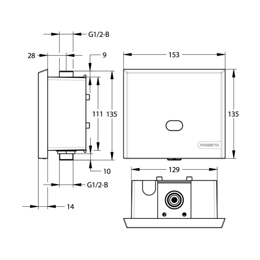Встраиваемый электронный клапан смыва из латуни с антивандальной лицевой панелью из нержавеющей стали 304L (матовое чёрное покрытие), габаритами 135 × 153 × 44 мм и весом 0,5 кг; инфракрасный сенсор с дальностью обнаружения 80–120 см, длительностью слива 6 секунд (программируемая от 3 до 10 с), расход воды 8 л/мин при давлении 1–8 бар. Питание от сети 230 В (в комплекте трансформатор) или 4 батарейки AA (до 3 лет автономии), электромагнитный запорный клапан с автоматическим отключением при утечке; встроенная функция экономии (дути-флаш каждые 24 ч) и регулировка интенсивности смыва. Совместим с подводом воды G1/2" (сбоку или снизу), выход для писсуара DN15–DN20; IP54 защита от влаги. Производство PRESTO (Франция), гарантия 10 лет на корпус и механизм, 2 года на электронику.
