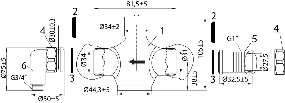 Настенный кран с кнопкой в сборе – 1 шт. Прокладка цангового зажима – 2 шт. Прокладка плоская для переходника – 2 шт. Гайка зажимная – 2 шт. Переходник на G1 НР – 1 шт. Угловой переходник на G3/4 НР – 1 шт. Руководство по эксплуатации – 1 шт.