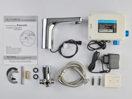Комплект: смеситель, блок питания (FCCC), гибкая подводка для воды (батарейки не входят), руководство по эксплуатации; совместим с раковинами в ванных, кухнях или общественных зонах от брендов типа Grohe или стандартных, монтируется на столешницу на 1 отверстие (на гайке) без декоративной пластины в санузлах от 1 м², на бетон или керамику. Отличается латунным корпусом для повышенной прочности и экологичности, превосходя пластиковые варианты по стойкости к коррозии и истиранию в условиях высокой влажности; настройка температуры механическим термостатом под раковиной.