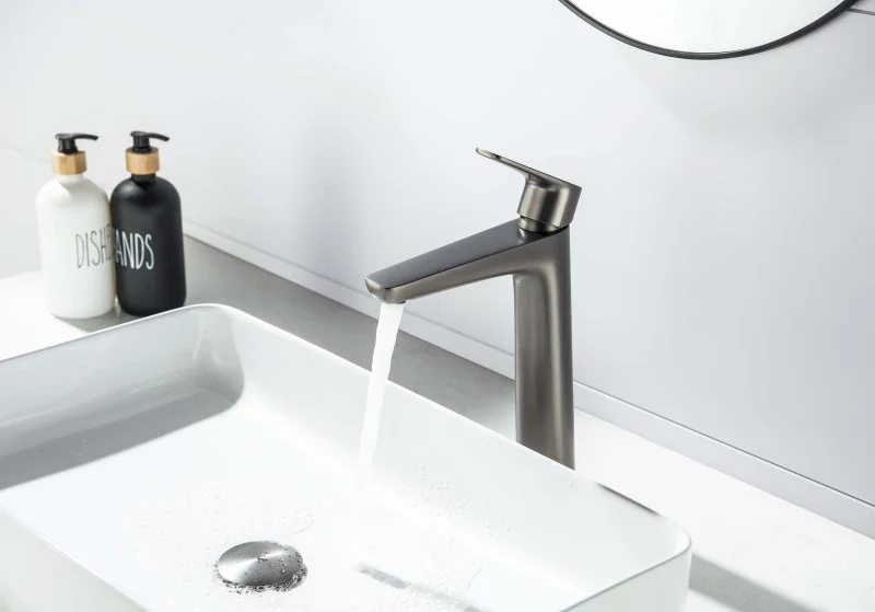 Высокий смеситель (высота излива 229 мм, длина излива 165 мм) для установки на раковину, изготовлен из латуни с износостойким покрытием под оружейную сталь. Оснащён керамическим картриджем для точной регулировки температуры и напора воды, фиксированный излив обеспечивает стабильную подачу.