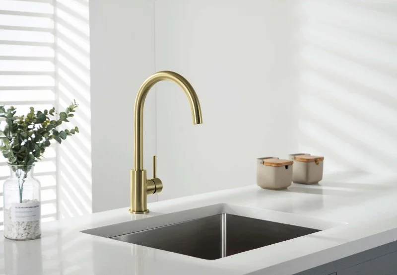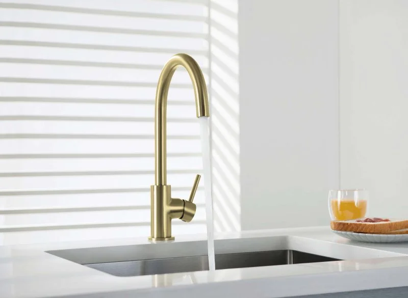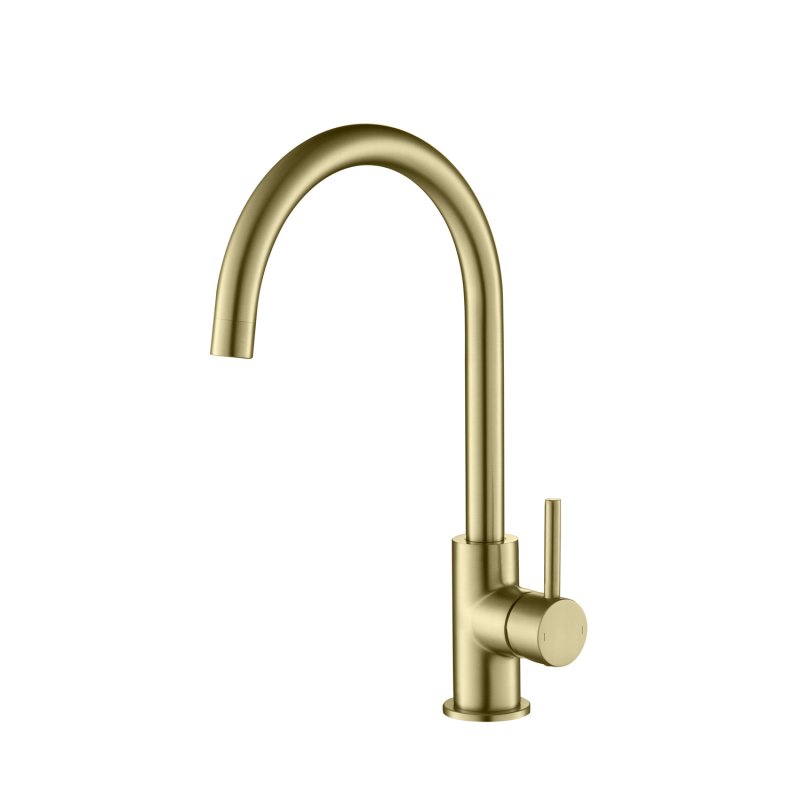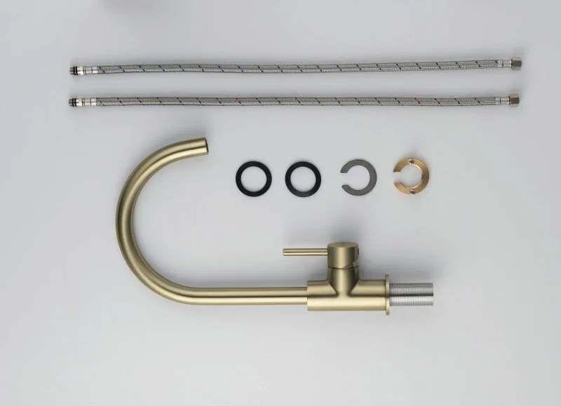 Встраиваемый кухонный смеситель премиум-класса с цельнолитым корпусом из латуни и износостойким покрытием “шлифованное золото”. Поворотный излив на 360° обеспечивает максимальное удобство при работе с мойкой любого формата. Однорычажное управление и керамический картридж гарантируют плавную и точную регулировку напора и температуры воды.
