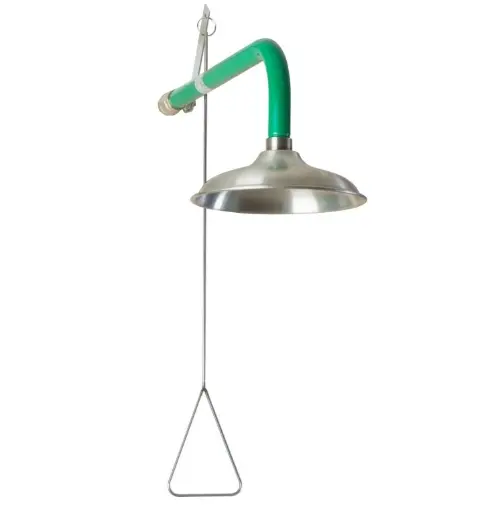 Аварийный душ настенный сделан из оцинкованной стали, лейка душа выполнена из полипропилена. Душ самопомощи покрашен в сигнальный зеленый цвет