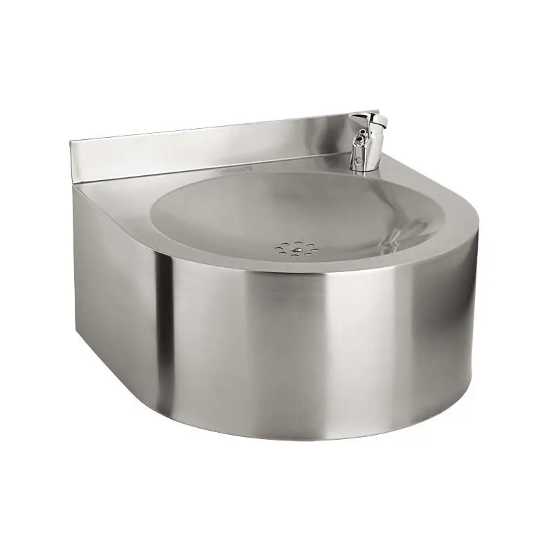 Питьевой фонтан из нержавеющей стали, нажимная арматура, угловой вентиль с фильтром, соединительный шланг, сифон, крепёжный комплект.