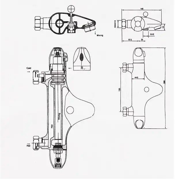 Термостатический смеситель из латуни с хромированной поверхностью, автоматически смешивает и поддерживает заданную температуру воды (диапазон 20-50°C, предохранитель 38°C, опция ограничения до 43°C). Габариты: длина ~280 мм, монтажные отверстия 32 мм, излив 130 мм; керамический картридж 1/2" (180°), отвод для душа 1/2", рабочее давление мин. 1 бар, встроенный термоэлемент, стопор смешанной воды, обратные клапаны, фильтры от грязи, скрытые S-образные эксцентрики. Производство Zeta (Китай), гарантия 1 год, универсален для ванны и душа.