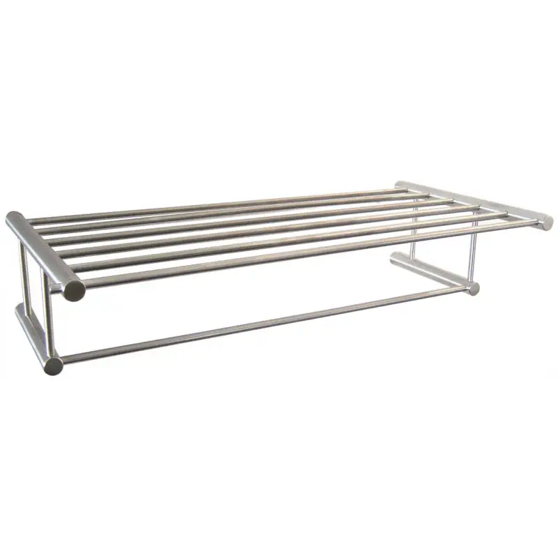Полка для полотенец с вешалкой для настенного монтажа, изготовленная из нержавеющей стали AISI 304 с сатинированной отделкой. Полка состоит из шести бесшовных прутьев диаметром 8 мм из нержавеющей стали AISI 304, толщиной 0,8 мм и двух кронштейнов из нержавеющей стали AISI 304 диаметром 18 мм, толщиной 0,8 мм. Эта полка для полотенец с плавными чистыми линиями, соответствующими современным ванным комнатам, подходит для гостиничного сектора, для оснащения ванных комнат в гостиничных номерах. Конструкция из нержавеющей стали обеспечивает долговечность и устойчивость к ржавчине. Не имеет съемных элементов. Обычно комплектуется дозатором для мыла из нержавеющей стали и сушилкой для рук. Винты и дюбели для установки на стену прилагаются.
