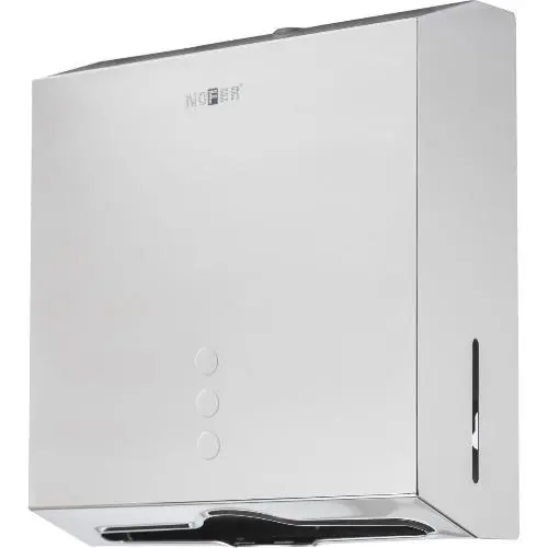 Диспенсер для бумажных полотенец из нержавеющей стали. Фронтальная заправка бумаги. Подходит для сложенных или обжатых (зигзагообразных) полотенец. Прочность и стойкость к коррозии. Изготовлен из нержавеющей стали AISI 304. Вместимость: 500 полотенец.