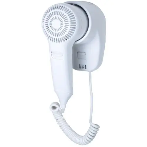 Фен настенный электрический для гостиниц белый 1200 W. Корпус из белого пластика, Напряжение: 220 - 240 В. Частота: 50 Гц - 60 Гц. Мощность: 1200 (макс.) - 540 (мин.) Вт., Потребление электроэнергии: 5,5 А, Электроизоляция: класс II, Электрозащита: IP20, Скорость воздуха: 48 км / ч, Расход воздуха: 1300 л / мин., Звуковое давление: 60 дБА. Фен предназначен для сушки волос. Гарантия 2 года. Данное устройство имеет всего 1 режим работы. Скорость потока воздуха: 13 метров в секунду. Температура воздушного потока 65 градусов С